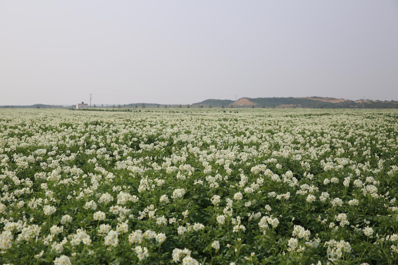 陜西省土地工程建設(shè)集團(tuán)利用砒砂巖與沙復(fù)配成土技術(shù)將榆林毛烏素沙地變成良田,圖為整治后盛開(kāi)的土豆花。