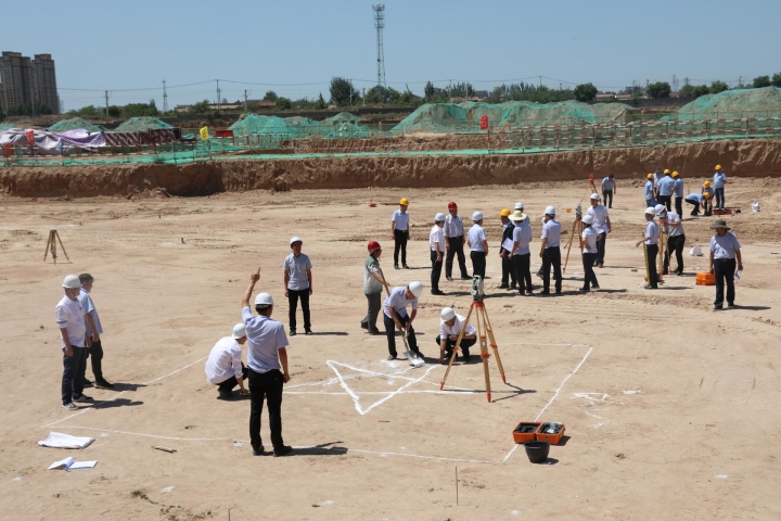 比賽現(xiàn)場(chǎng),參賽員工手拿鋼卷尺、墨斗、線繩、紅藍(lán)鉛筆及經(jīng)緯儀,在指定區(qū)域內(nèi)根據(jù)基準(zhǔn)線,繪制邊長(zhǎng)為3m的五角星。同時(shí),根據(jù)給定試卷問(wèn)題,在規(guī)定時(shí)間內(nèi)作答,答題正確率越高,得分越高。
