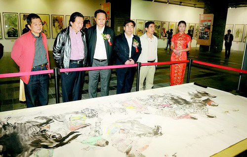 這次展覽不僅匯聚了當(dāng)今美術(shù)界最強(qiáng)的創(chuàng)作陣容,展示了山水、花鳥(niǎo)、人物等多個(gè)美術(shù)類別的最佳作品,而且其陣容之大、水平之高、實(shí)力之強(qiáng),在全國(guó)的美術(shù)展覽中都是難得一見(jiàn)的,無(wú)疑代表了中國(guó)畫(huà)創(chuàng)作的整體最高水準(zhǔn)。當(dāng)天,黃土畫(huà)派藝術(shù)研究院院長(zhǎng)、西安美術(shù)學(xué)院名譽(yù)院長(zhǎng)劉文西,中國(guó)國(guó)家畫(huà)院院長(zhǎng)楊曉陽(yáng),中國(guó)國(guó)家畫(huà)院副院長(zhǎng)張江舟,中國(guó)國(guó)家畫(huà)院交流中心主任蔡敏以及陜西省著名畫(huà)家陳光健、姜怡翔、劉永杰、李玉田等都出席了開(kāi)幕式。這次展覽共展出百名畫(huà)家的76幅精品力作,其中6幅是國(guó)家泰斗級(jí)畫(huà)家合作的丈二大畫(huà),其余以四尺精品畫(huà)居多,展期歷時(shí)5天。
