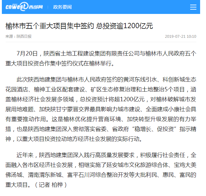 7月20日,陜西省土地工程建設(shè)集團(tuán)有限責(zé)任公司與榆林市人民政府五個(gè)重大項(xiàng)目投資合作集中簽約儀式在榆林舉行。